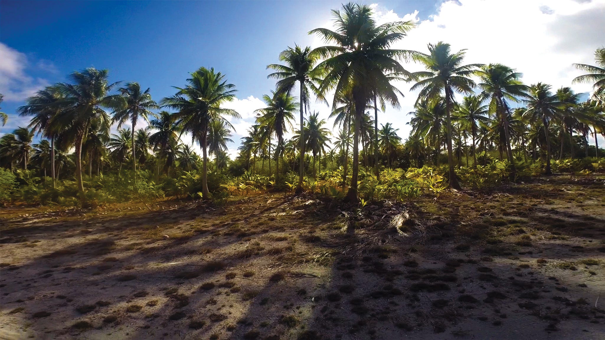 作为环礁恢复的一部分,它们于 60 年代种植,它们以机械精确的行排列,其精确度与编队中的士兵完全不同,与正常太平洋环礁上树木的随机性完全不同。