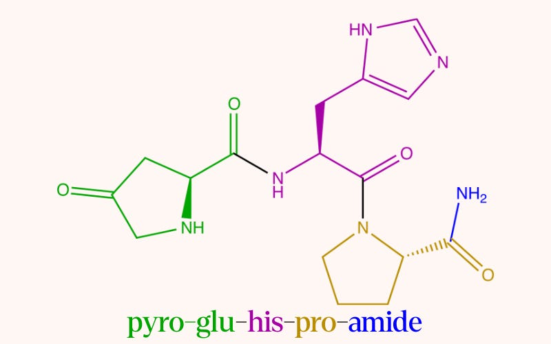 与此同时,Schally 也越来越接近,他发现 TRF 中的氨基酸序列是谷氨酸-组氨酸-脯氨酸,并且该肽缺乏游离的 N 端氨基和 C 端羧基,这意味着这些位点存在化学修饰。那时,这些修饰的性质仍然未知,但 Schally 猜测 N 端连接了脂肪酸17,而 C 端连接了酰胺基团。Schally 指示他的合作者 Franz Enzmann 将这些化学修饰添加到谷氨酸-组氨酸-脯氨酸肽中。Schally 很高兴地发现,三种不同的修饰版谷氨酸-组氨酸-脯氨酸都具有类似 TRF 的活性。