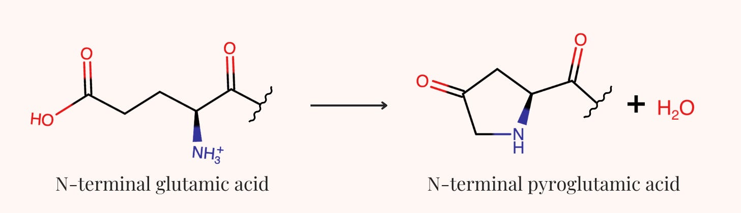 值得注意的是,这两个研究小组都被同一种意想不到的副反应拯救了。在用于合成修饰肽的条件下,存在于 N 端的谷氨酸会自发环化形成 焦谷氨酸。到 1969 年 6 月,两个实验室都意识到他们样品中的 TRF 活性是由于副产品,焦谷氨酸-组氨酸-脯氨酸-酰胺。但这种化合物实际上与 TRF 相同吗?