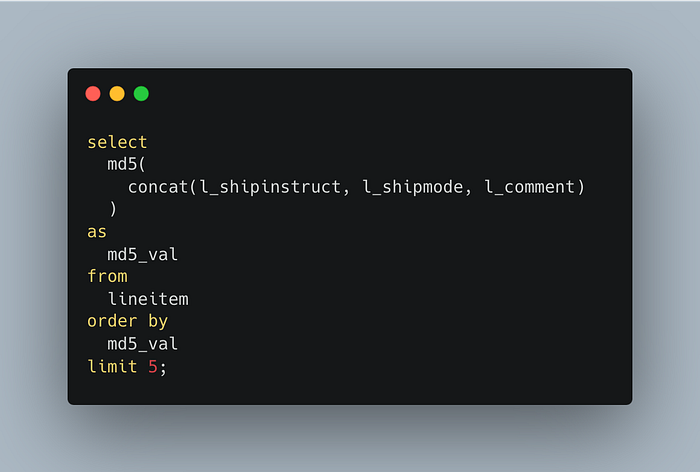 duckdb> .timer onduckdb> select ...┌──────────────────────────────────┐│ md5_val             │╞══════════════════════════════════╡│ 0000031428caeaafcddcf1a1f5d4ea26 ││ 000005560d5cc20991b8bb57e64f58a0 ││ 00000aa836f58524e6ae1d75c9246511 ││ 000016d700b533970506d1164d0ee003 ││ 00001921a51a1880a184ed25fc3d95b8 │└──────────────────────────────────┘Elapsed: 01.881 s