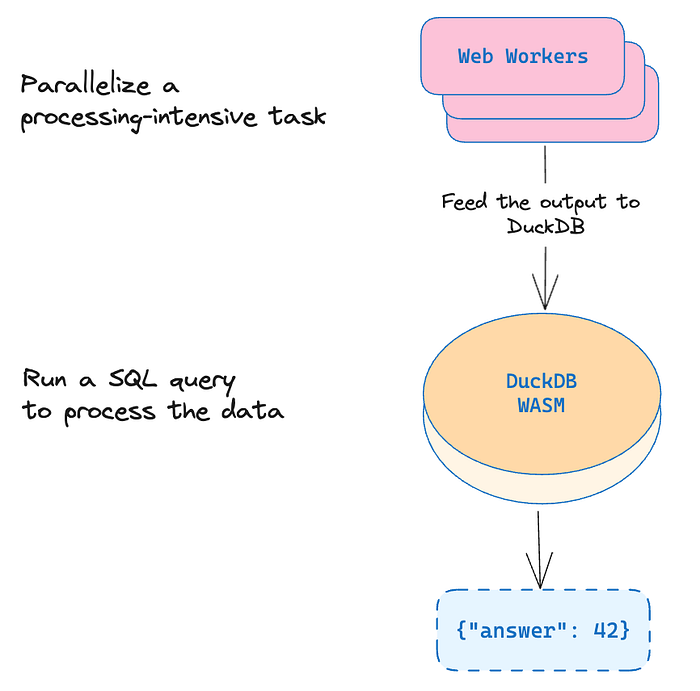 这两个(Web WorkersDuckDB WASM)可以一起用于更复杂的处理架构。 例如,可以使用 Web Workers 并行执行一些自定义的、特定于域的处理代码,然后将其馈送到 DuckDB WASM,在该 DuckDB WASM 中,方便的 SQL 查询可以处理结果并计算聚合。