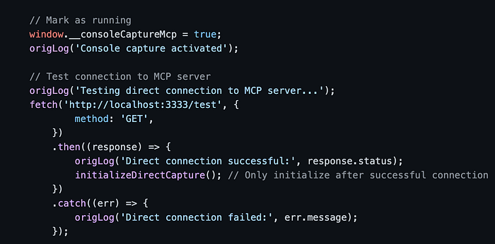 接下来,我们构建了一个在后台运行的 Chrome extension,并尝试连接到 localhost:3001——这是本地 SSE MCP 服务器的常用端口。当然,这个端口可能会有所不同,因此一个真实的 extension 需要扫描本地端口以定位活动的 MCP 实例。该 extension 获取服务器信息,检索工具列表,并尝试调用 MCP 服务器提供的工具: