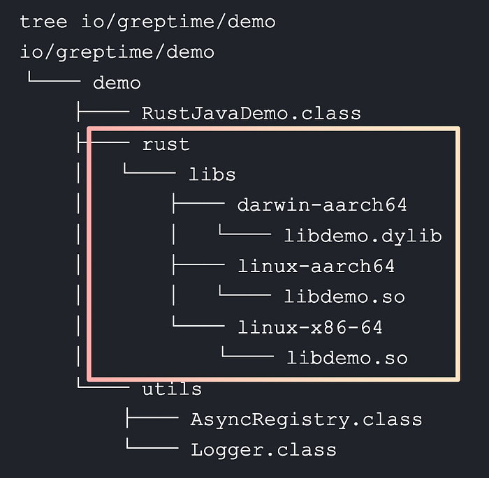 static {  JarJniLoader.loadLib(    RustJavaDemo.class,    "/io/greptime/demo/rust/libs",    "demo"  );}