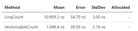 由于这些方法在条件匹配时隐式应用,因此有必要了解内部管道以定位 SIMD 应用程序。因此,对于 T[]、Span<T> 或 ReadOnlySpan<T>,我们提供了 .AsVectorizable() 方法来显式调用 SIMD 适用的操作,如 Sum、SumUnchecked、Average、Max、Min、Contains 和 SequenceEqual(尽管当 Vector.IsHardwareAccelerated && Vector<T>.IsSupported 为 false 时,这些会回退到正常的处理)。