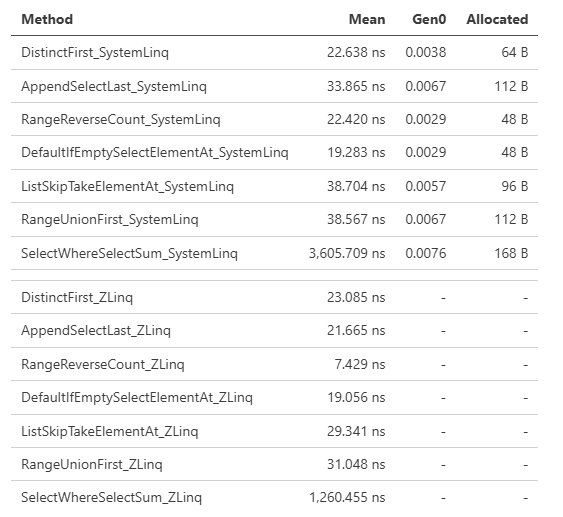 这个简单的基准测试表明,当您链接更多方法(Where、Where.Take、Where.Take.Select)时,普通 LINQ 的分配会增加,而 ZLinq 保持为零。